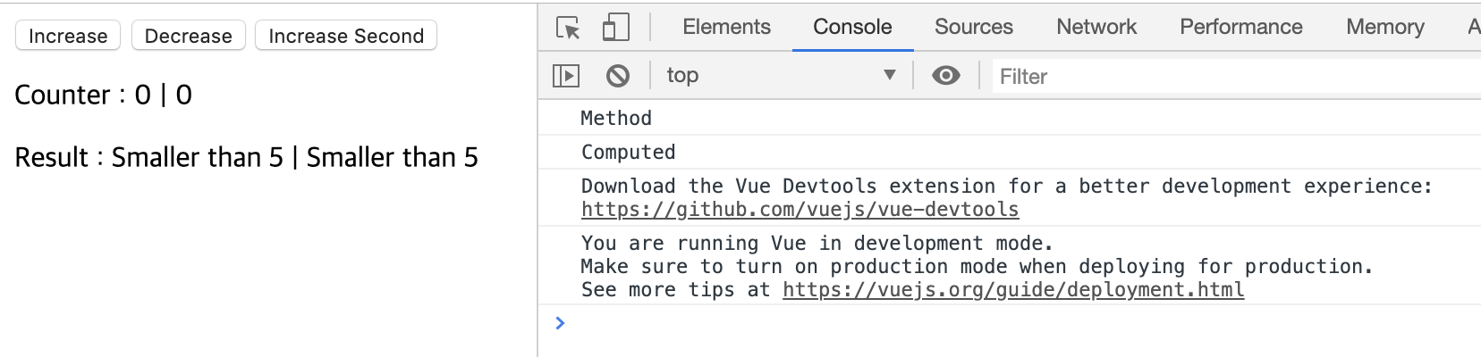 위 코드를 보면 html 코드에 삽입된 Interpolation 으로 인해 최초 렌더링이 될 때, computed의 output 메서드와 methods의 result 메서드가 호출되어 콘솔 출력이 된 것을 볼 수 있습니다. 현재의 코드에서 Increase 나 Decrease 버튼을 누르면 counter 값이 변경되어 DOM 상에서 전체적으로 렌더링이 일어납니다.