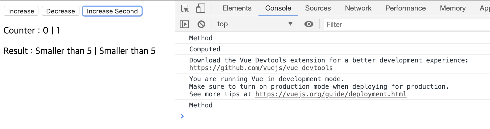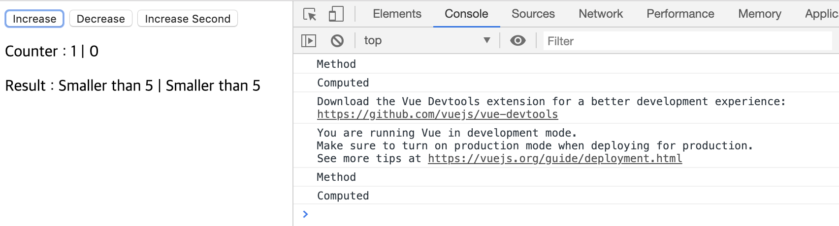 IncreaseSecond 버튼은 클릭 시, secondCounter 값을 변경 시키므로 렌더링이 되어 마찬가지로 methods의 result() 함수가 호출될 것입니다. 하지만, secondCounter 속성은 computed의 output 속성과는 아무런 의존관계가 없으므로 호출되지 않습니다.