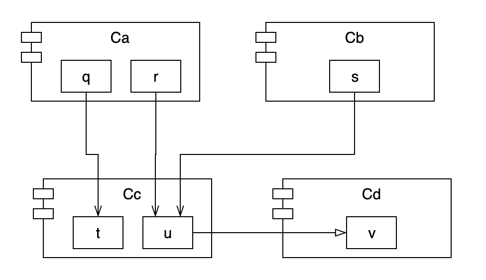 이러한 문제는 DIP를 통해 문제를 해결할 수 있습니다. 먼저 US라는 인터페이스를 생성한 후 UServer 컴포넌트에 넣습니다. 이때 US 인터페이스에는 U가 사용하는 모든 메서드가 반드시 선언되어 있어야 합니다. 그리고 나서 아래의 그림처럼 C가 해당 인터페이스를 구현하도록 만듭니다. 이를 통해 stable의 Flexible에 대한 의존성을 끊을 수 있고, 두 컴포넌트는 모두 UServer에 의존하도록 강제합니다. UServer는 매우 안정된 상태이며(I = 0), Flexible은 자신에게 맞는 불안정성(I = 1)을 그대로 유지할 수 있게 되었습니다. 이제 모든 의존성은 I가 감소하는 방향으로 흐르게 되었습니다.