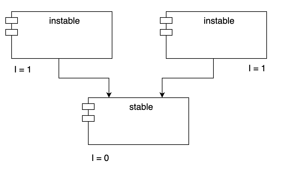 - I (불안정성) : I = Fan-out / (Fan-in + Fan-out). 이 지표는 [0, 1] 범위의 값을 갖습니다. I = 0 이면 최고로 안정된 컴포넌트라는 뜻이고, I = 1 이면 최고로 불안정한 컴포넌트라는 뜻입니다.