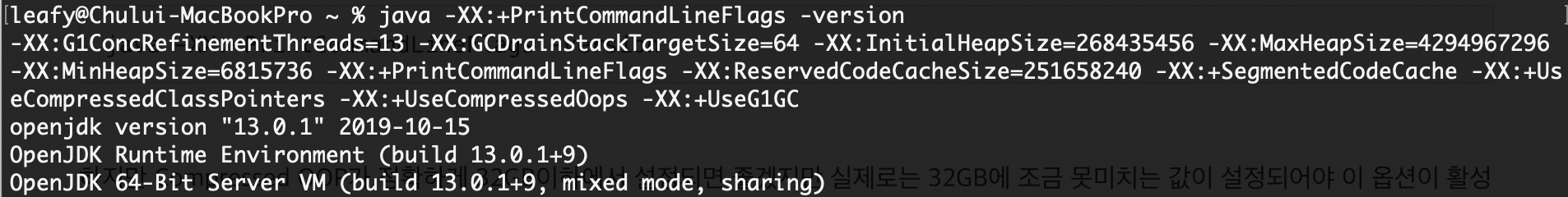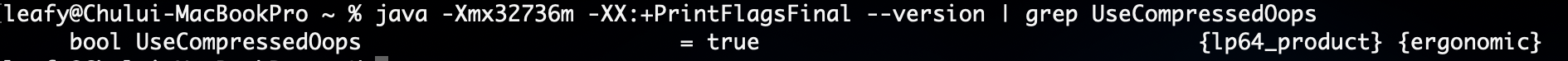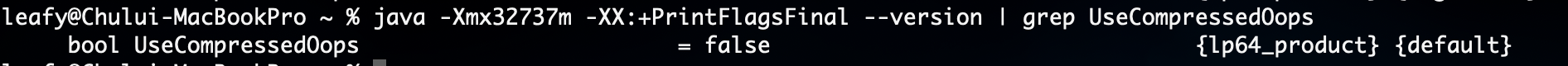 Compressed OOP는 JDK8 이상에서는 기본으로 이 옵션이 활성화되어 있기 때문에 32GB 이하의 힙 메모리를 설정하는 것만으로도 손쉽게 설정이 가능합니다. 아래의 방법으로 여러 옵션들을 조회할 수 있습니다.