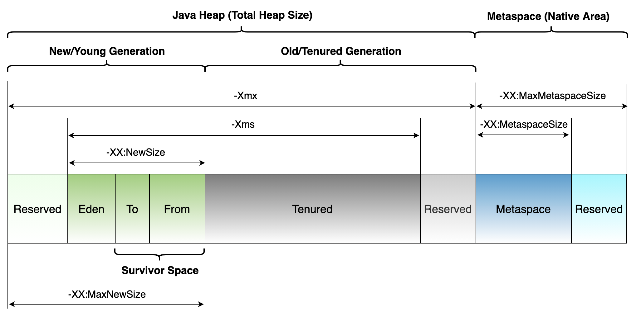 자바 프로세스가 시작되면 JVM은 메모리를 할당(또는 예약)하고 유저 공간에서 연속된 단일 메모리 풀을 관리합니다.